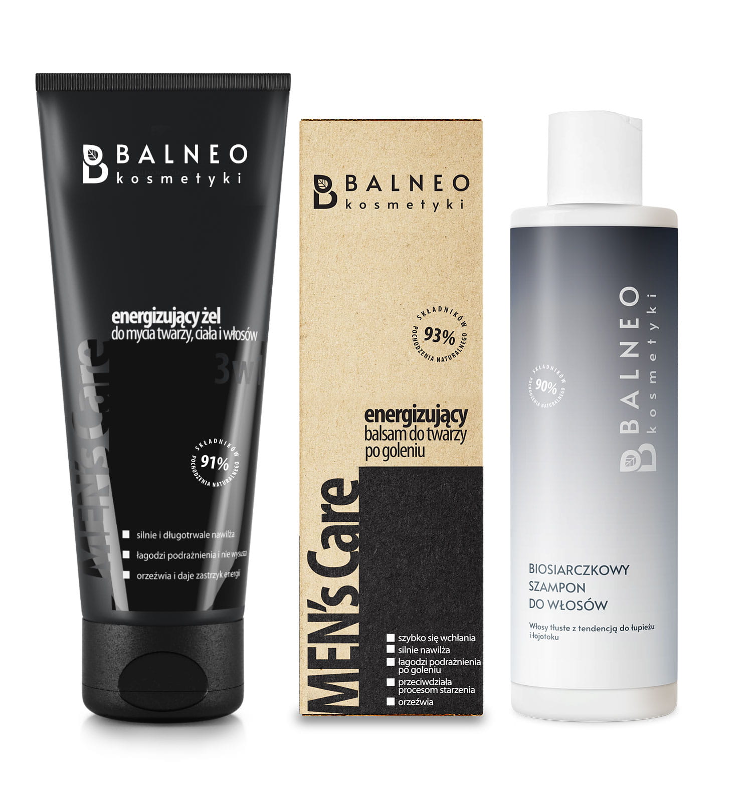 Zestaw do codziennej i kompleksowej pielęgnacji całego ciała stworzony z myślą o wymaganiach męskiej skóry. Zawiera aż 90% (szampon), 91% (żel), 93% (balsam) składników pochodzenia naturalnego. Skutecznie oczyszcza skórę twarzy, ciała, głowy oraz włosy z tendencją do łupieżu lub przetłuszczania nie wysuszając ich. Intensywnie i długotrwale nawilża oraz łagodzi podrażnienia po goleniu, a elegancki i świeży zapach daje zastrzyk energii.